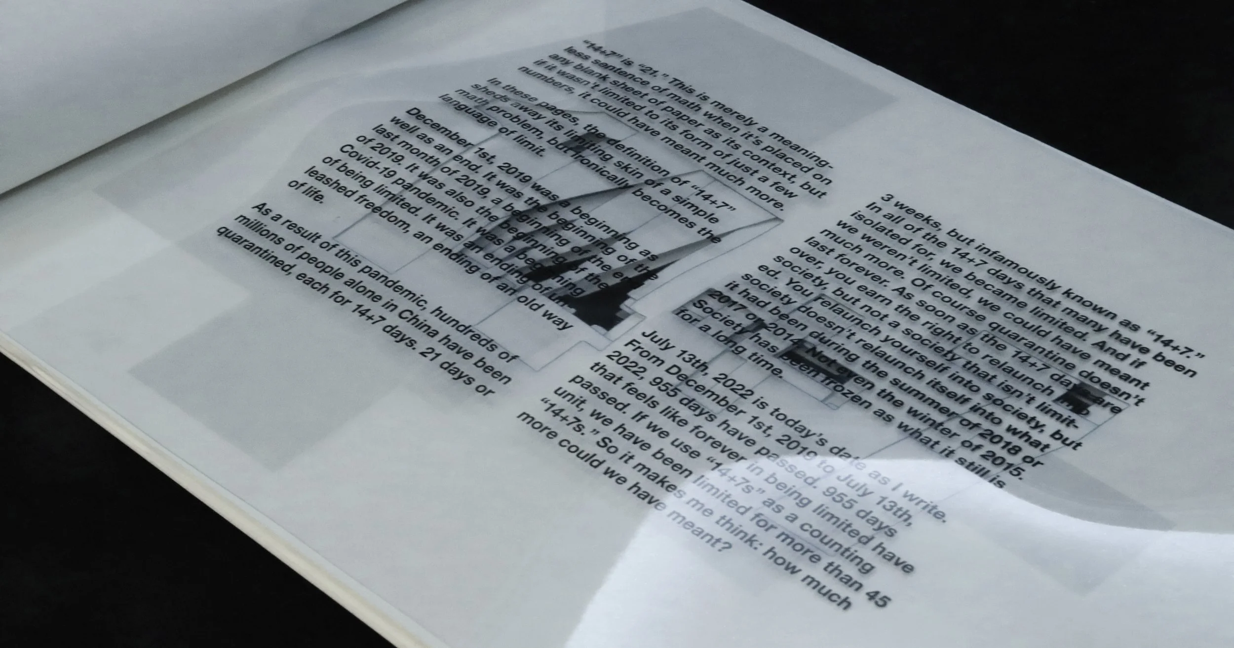 As a result of this pandemic, hundreds of millions of people alone in China have been quarantined, each for 14+7 days. 21 days or 3 weeks, but infamously known as “14+7.” In all of the 14+7 days that many have been isolated for, we became restricted. Had we not been restricted, we could have meant much more. The physically burnt-through photography and typography in this book embodies the deterioration of meaning during years of “14+7.” It manifests the myriad of meanings we lost in our lives.