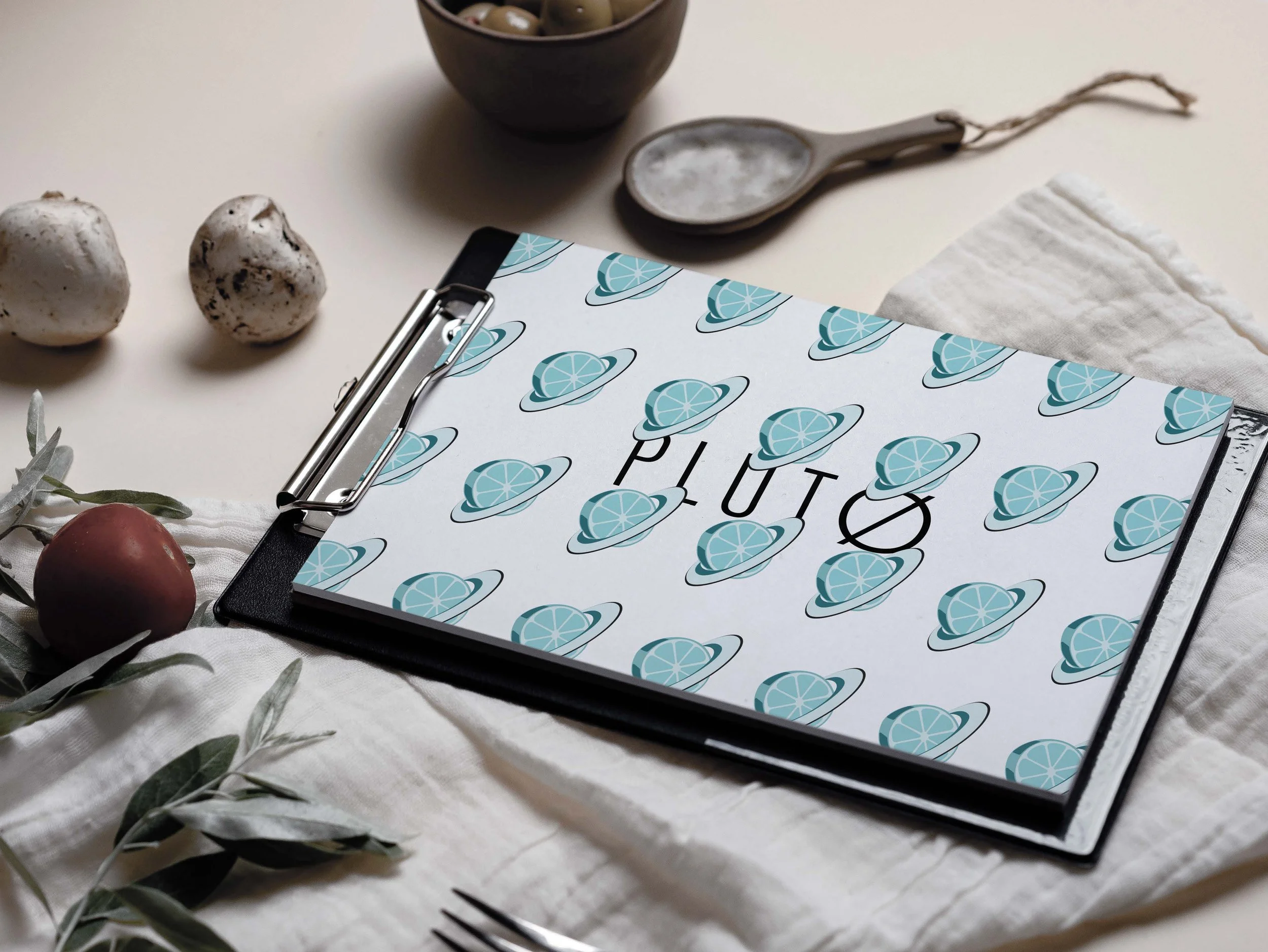 04 / Branding Design Plutø FL23_Digital Studio Defining the Brand Plutø is a relaxed, spacey, stellar, and dim-lighted bar. At Plutø, you’ll sit in comfy sofas, barstools, and share a conversation over the best jazz and the best drinks. Enjoy the green plants and tasty snacks. Chill at Plutø. Color Palette Icon Iterations Final Logo